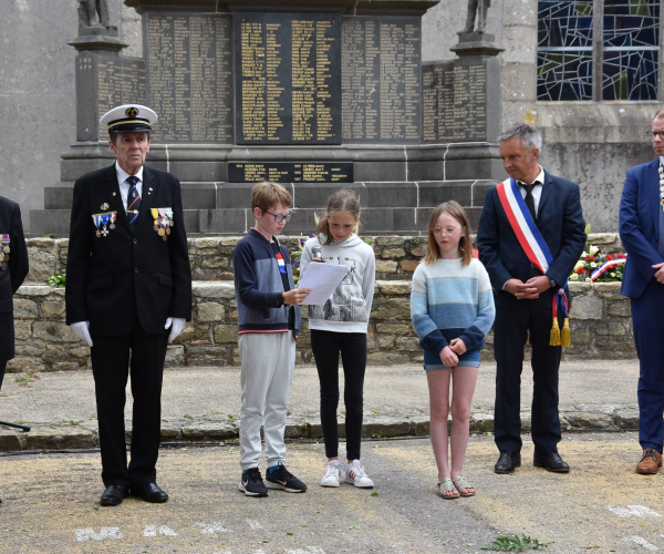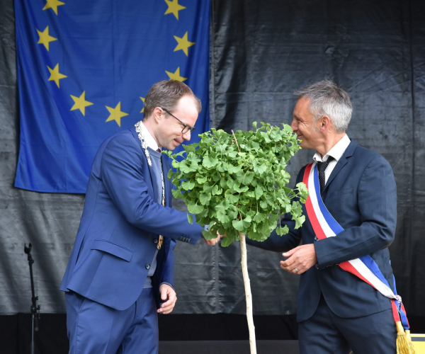 Nach dem Gottesdienst gab es eine Gedenkfeier am Denkmal für die Gefallenen beider Weltkriege, das vor 100 Jahren erbaut wurde. BM Robin sprach in Anwesenheit des Veteranenverbandes „Anciens combattants“ zu den ca. 500 Teilnehmenden. Französische und deutsche Kinder trugen Gedichte vor und beide BM legten Blumengebinde nieder, bevor die Dudelsackgruppe Bro even nach Spielen der Europa-Hymne alle Besucherinnen in einem kleinen Festumzug zur Mediathek geleitete, wo der offizielle Festakt stattfand.