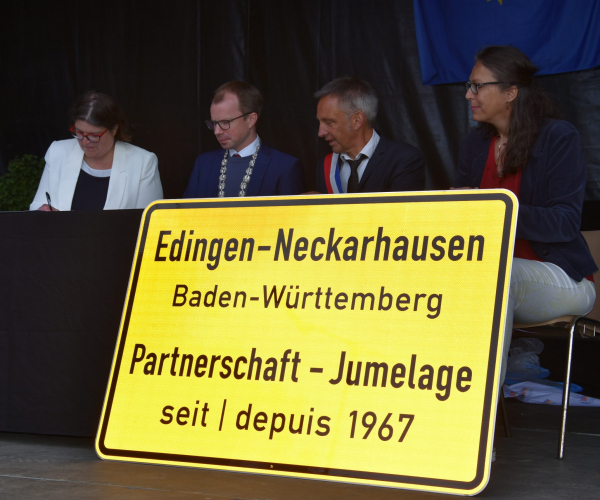 BM Michler überreichte das Gastgeschenk der Gemeinde: Ein originales gelbes Ortseingangsschild von Edingen-Neckarhausen. Die Gemeinde Plouguerneau schenkte unserer Gemeinde einen Ginkgo-Baum, der laut BM Robin ein Symbol für Langlebigkeit und Erneuerung ist.