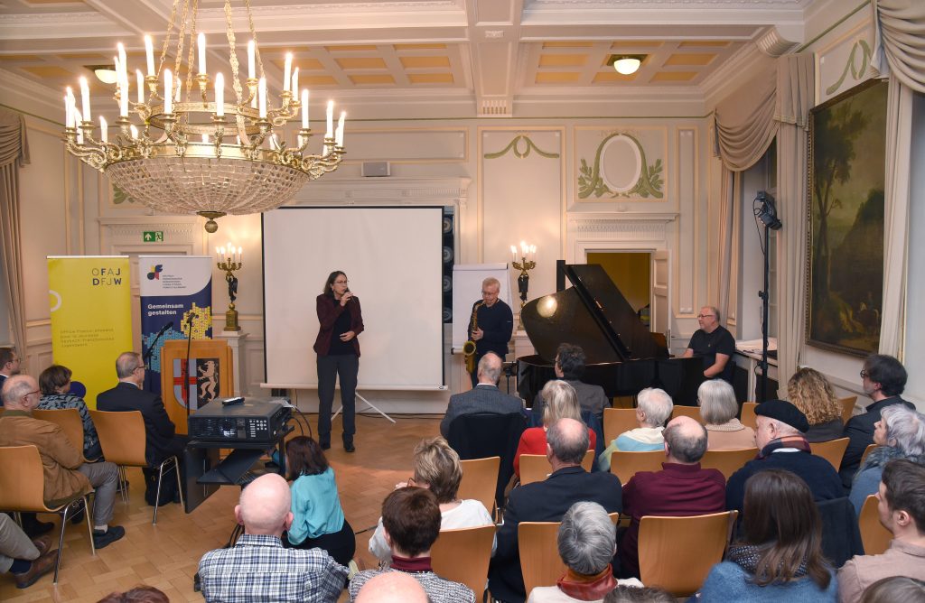 Vorsitzende Susanne Surblys konnte in einem voll besetzten Schlosssaal IGP-Mitglieder und Frankreich-Freunde, darunter Bürgermeister Florian König, begrüßen, ganz besonders den Politologen Prof. Henri Ménudier aus Paris, IGP-Ehrenmitglied, sowie den Pädagogen, Mediator und langjährigen pädagogischen Mitarbeiter des DFJW, Timm Uekermann, aus Berlin. Prof. Ménudier referierte über die aktuelle Krise in Frankreich und ihren Einfluss auf die deutsch-französischen Beziehungen. Dabei ging er auf die Unterschiede in der Bewältigung von Krisen in den Partnerländern ein, die auch historische Ursprünge haben. Timm Uekermann sprach über seine Erfahrungen als langjähriger Akteur im deutsch-französischen Austausch und empfiehl u.a. die Nutzung der DFJW-Programme, darunter die für die Sprachvermittlung wichtigen Seminare zur Ausbildung von Gruppendolmetschern. Erwin Hund ging auf die Anfänge der IGP in den Jahren 1975/1976 ein und ermutigte, den eingeschlagenen Weg mit regelmäßigem Jugendaustausch, trotz aller Schwierigkeiten, fortzusetzen. Er grüßte vom Deutsch-Französischen Bürgerfonds, der die Soirée förderte. Die Gruppe „Francophon mit Saxophon untermalte mit hervorragender Musik diesen Abend, über den wir weiter berichten werden.